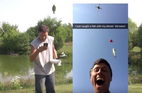 美國堪薩斯州男子克林根貝格(Derek Klingenberg),日前突發奇想用空拍機取代釣竿,沒想到竟然真的釣到一條小魚,讓他忍不住興奮地拿起手機和第一隻「空拍機魚」自拍,並將這段釣魚過程上傳至YouTube與網友分享。