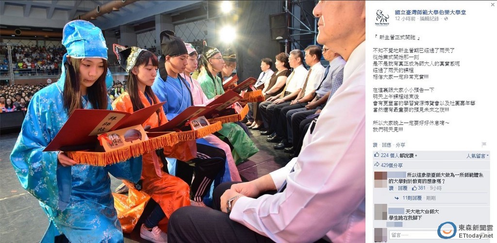 臉書粉絲專頁「國立臺灣師範大學伯樂大學堂」10日PO文,「新生營正式開跑,不知不覺地新生營期已經過了兩天了,從始業式開始那一刻,是不是就有真正成為師大人的真實感呢?經過了兩天的課程,相信大家一定非常充實!」然後附上了那張引起爭議的照片。