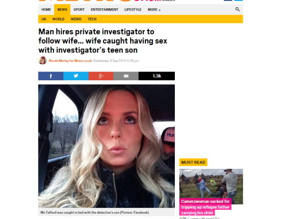 根據英國《都市報》(Metro)報導,33歲的人妻安柏(Amber Telford)和丈夫育有3子,她是一名舞蹈老師。去年9月她申請離婚,丈夫驚覺有異懷疑她出軌,因此聘任私家偵探進行調查。2個月後過去,私家偵探果然找到安柏出軌的證據。