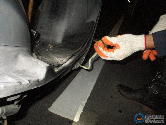 美濃分隊表示,由隊員林滕枋和役男郭仕毅、蘇文祺出勤趕到現場,其中郭仕毅在服替代役前職業為修車師傅,對於車體的拆卸及安裝非常了解,於是慢慢將車殼拆下,弟兄們拿手電筒趴在地上小心翼翼仔細搜索,就怕蛇突然竄出傷人,從車頭找到車尾,終於在車底盤靠近車架下方處發現蛇的蹤跡,立刻將以逮捕,是一條無毒的草花蛇,大約30公分長。