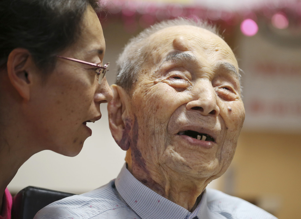 ▲日本厚生勞動省公布最新數據,表示百歲人瑞已經突破6萬大關。圖為當地最長壽男性,居住在名古屋的小出保太郎。(圖/達志影像/美聯社)