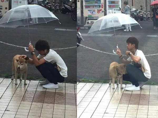 這張日本暖男照近日在各大網站傳開,據原po表示,當時突然下起雨,這位帥哥看到柴柴被綁在護欄,於是便跑去買傘,還幫牠撐傘,似乎是想要一起等主人回來。