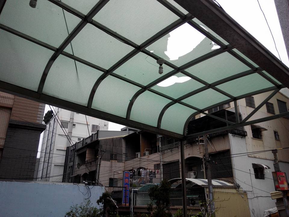 原PO家住永康區該處公寓,凌晨熟睡期間,突然聽到一聲巨響,趕緊起床查看,這才發現樓下的採光罩破了洞,當時以為是麻布袋之類的東西,直到天亮時再次從陽台觀看,「竟然是一條狗!」