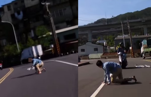 根據網友上傳的行車記錄器影片,14日下午3時多,騎士載人行經一處彎道,太接近對向的大貨車;後座男子疑被大貨車勾到,當場摔落地面,雙腳拖鞋飛了,腳上的鮮血流到地上,他為閃避後方來車,忍痛爬到路旁。