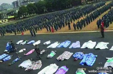 根據大陸《瀟湘晨報》報導,一名就讀湖南外國語職業學校的大一新生爆料,15日上午10時左右, 20多名女學生躺在瀝青跑道上,且身上還裹著棉被曬太陽,學校的教官還一一檢查,她們的棉被是否蓋的確實。