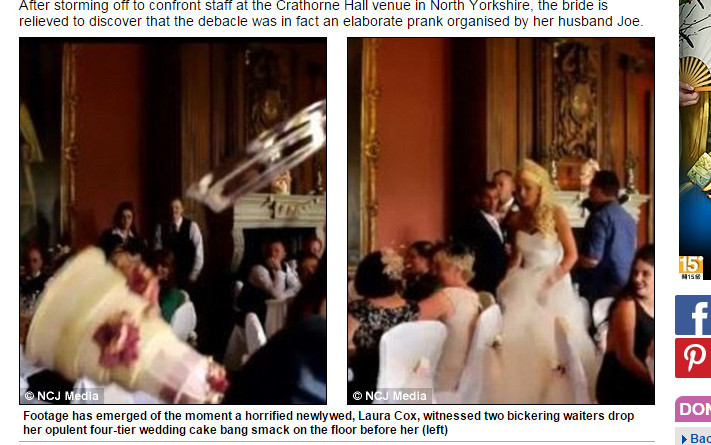 根據《每日郵報》報導,原來是專門籌辦特別活動(James Entertainments - Wedding & Events Specialists)的人員事先與新郎串通,讓他們假扮成服務生。雖然他們不願意提供惡作劇的技巧,但是並沒有將真正的蛋糕砸壞,也成功的完成惡作劇,讓新娘在當下又驚又煩躁。