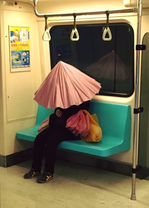 一名網友在「爆料公社」PO文指出,16日晚上在捷運板南線搭車時,發現有位女子大包小包坐在三人座上,手拿粉色大傘,半開躲在傘內,「一動也不動」,引起其他乘客注意,紛紛走避。根據網友Lin Dino表示,當晚捷運人潮並不多,女子怪異的行為雖無造成其他人困擾,但乘客還是不敢靠近,選擇坐其他位置。
