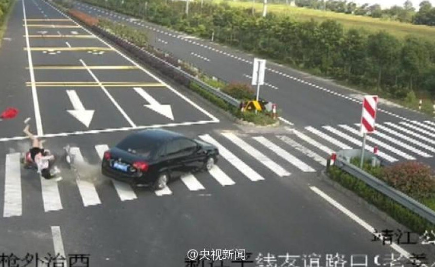 ▲撞上轎車後女子騰空而飛。(圖/翻攝自央視新聞)