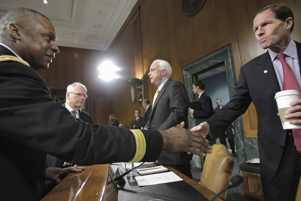 ▲奧斯汀(左)提到前線戰士人數吃緊。(圖/達志影像/美聯社)