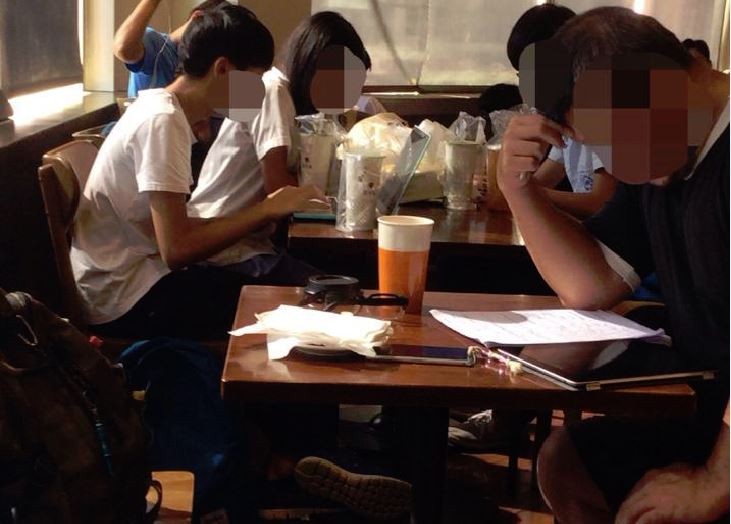 有網友在臉書社團「爆料公社」PO出一張沒水準的照片,地點疑似在台北捷運大安站對面的星巴克,只見3名年紀在國高中生之間的同學,在店內桌上擺滿手搖杯、外食,愜意的吃東西和打電腦。原PO氣憤地說,自己點了咖啡卻找不到位子,而學生們沒點餐卻霸佔坐位整個下午,公平嗎?