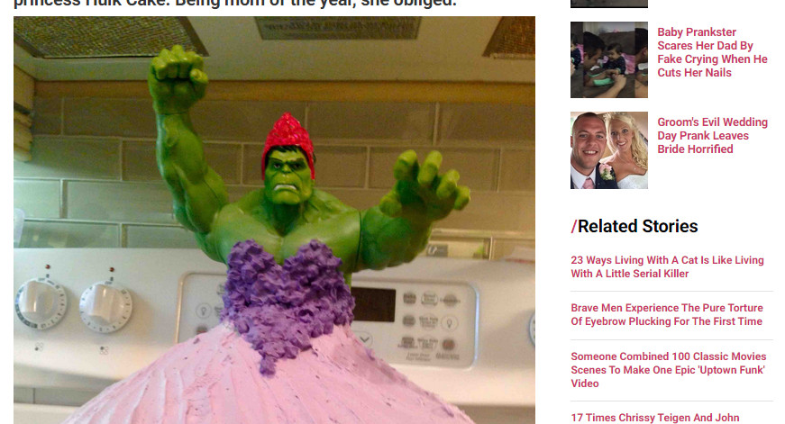 加拿大一對夫妻布萊恩•艾爾頓(Brian Elton)和蘭尼•艾爾頓(Lainie Elton)為了慶祝雙胞胎女兒的4歲生日,日前親手製作了「綠巨人公主」蛋糕。網友熱烈討論這個富具衝擊性的蛋糕,還有人一語雙關,借用「綠巨人」的經典台詞,稱讚綠巨人砸(Hulk smash)破了傳統性別角色。