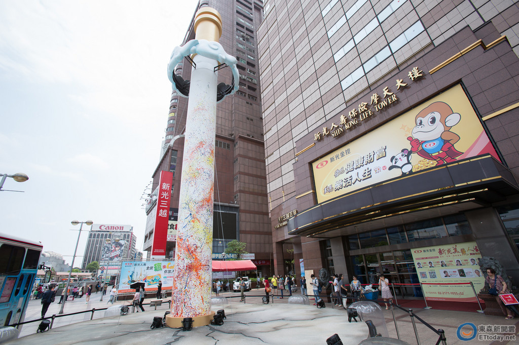 ▲巨型金箍棒就矗立在人來人往的新光三越站前廣場上,令人嘖嘖稱奇。(圖/記者季相儒攝)