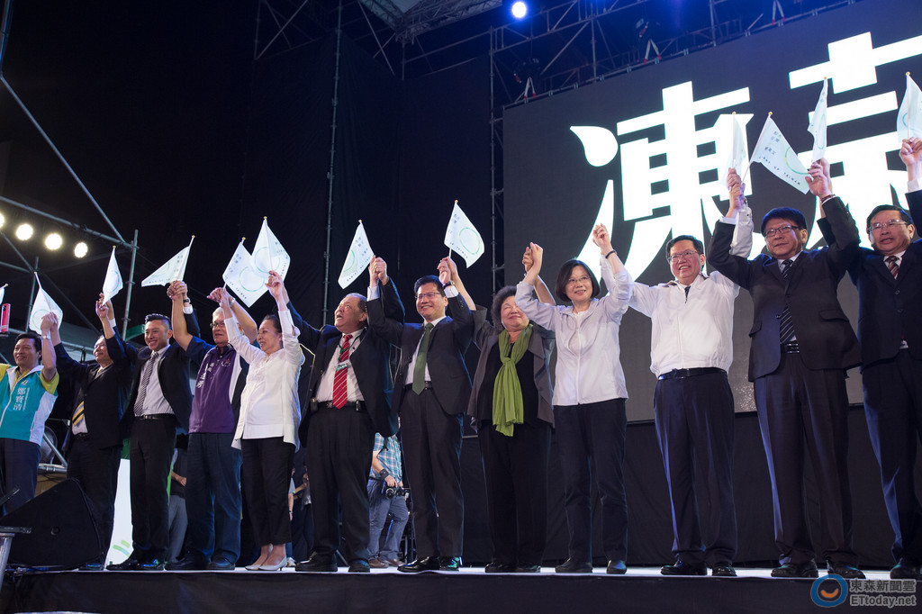 ▲民進黨首場大型造勢活動,蔡英文與13個執政縣市首長登台喊「凍蒜」。(圖/記者季相儒攝)