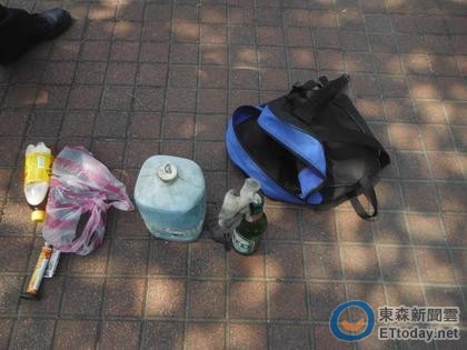 ▲警方在許姓男子包包內搜出縱火用棉手套、玻璃酒瓶等。(圖/楊佩琪翻攝)