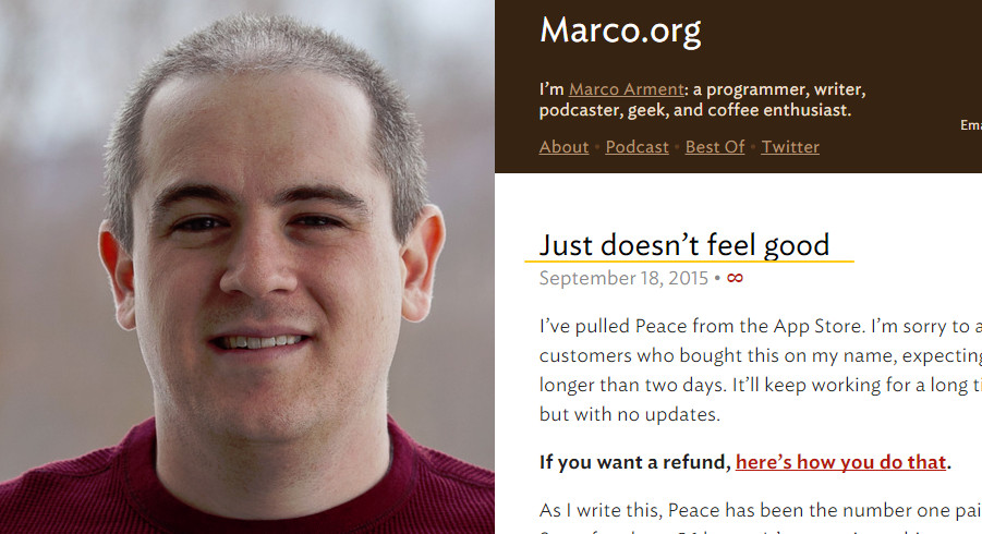 現年33歲的App Peace開發者亞曼特(Marco Arment)在他的部落格宣布下架訊息,他首先向購買的消費者道歉,接著對於Peace給他帶來的成功表示「感覺不是很好」,「因為這套應用程式確實讓部份的人受益,但也傷害了一些人,包括那些不該受傷的人。」