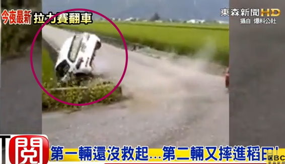 有民眾在台東關山親水公園附近舉辦跑車拉力賽,結果一輛車子在過彎時不小心掉到田裡,一群人趕緊上前去幫忙,結果這台車還沒被拉上來,又有另外一輛跑車衝過來,大家不斷揮手要對方別再過來了,這台跑車還是執意要過彎,又翻車摔進田裡了。