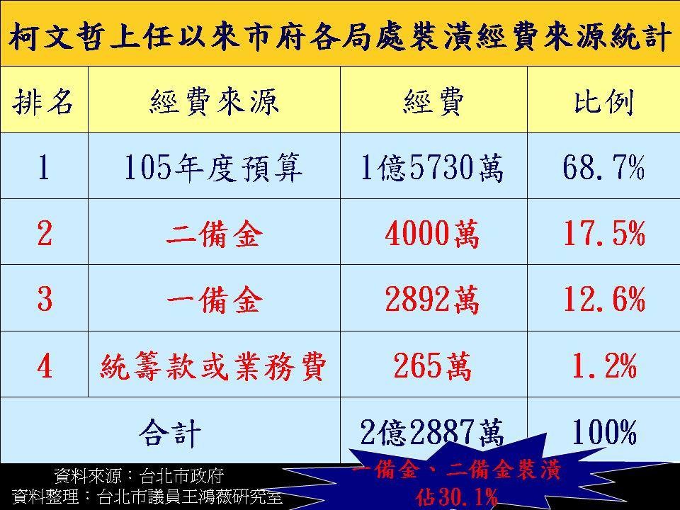 台北市長柯文哲上任以來,動用2.28億元裝潢局處辦公室,但國民黨議員王鴻薇調閱資料發現,其中有高達3成預算直接使用一備金、二備金,藉此迴避議會監督。她質疑,一、二備金員是為了因應緊急政務需求編列,卻變成裝潢費,且今年8月蘇迪勒颱風就讓市府花費近7億善後,今年若還有災害,市府如何因應?