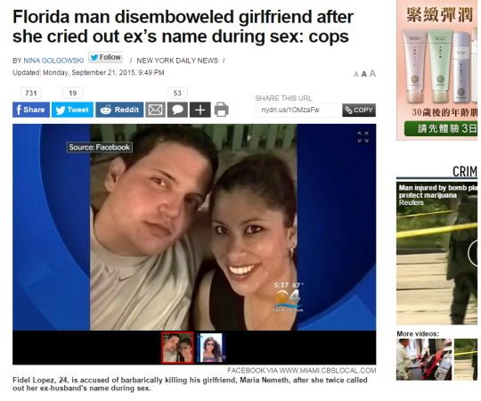 根據《紐約每日新聞》(New York Daily News)報導,佛羅里達州一名24歲的男子菲德爾(Fidel Lopez)19日和女友瑪麗亞(Maria Nemeth)嘿咻時,女友疑似喝醉了,過程中2度錯喊了前夫的名字,這讓菲爾德非常不爽,頓時失去理智,將瑪麗亞毒打一頓,甚至還用啤酒瓶等物品塞入她下體。