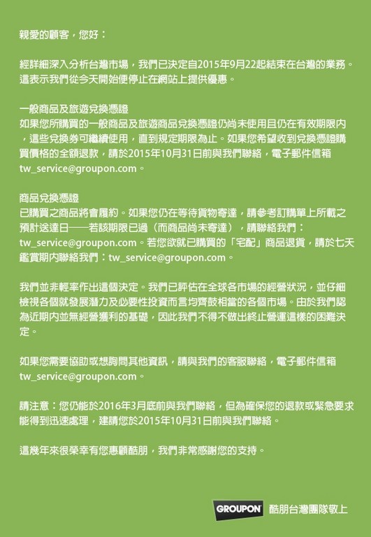 團購網酷朋(GROUPON)昨晚於台灣官網公告「即日起終止在台灣地區的營運」,並指出所購買的一般商品及旅遊商品兌換憑證仍可繼續進行兌換,直到規定期限為止,針對欲辦理退費的消費者,若希望收到兌換憑證購買價格的全額退款,可於10月31日前寄信至客服信箱申請,洽詢服務至2016年3月底止。