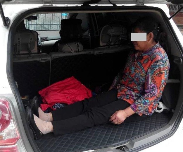 湖北警方查緝違規車輛,意外發現一輛車後車廂蜷蹲著一名老婦人,一問才知道是老婦拿養老積蓄給兒子買車,沒想到孫子嫌車裡太擠,兒子就讓老母親蹲到後車廂,騰出後排空間給孫子睡覺。(上圖/取自人民網)