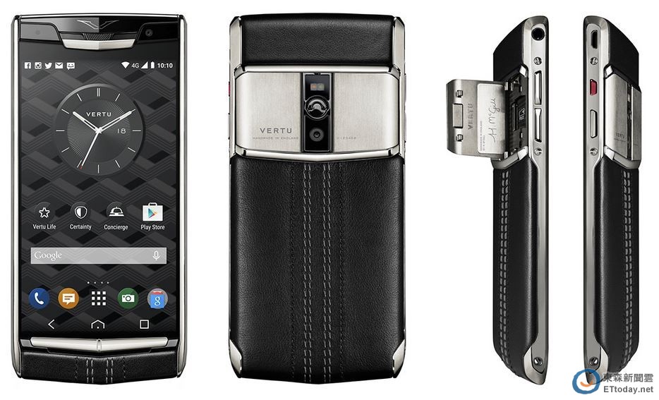 而既然掛上 Vertu 這牌子,產品必然奢華,每一款手機標榜純手工打造,該款手機採用真皮包覆背蓋,並依照真皮的等級而有不同售價,機身一樣採用全金屬鍛造,同樣有陶瓷聽枕、紅寶石按鈕,並在機背的 nano SIM 卡、microSD 卡槽提供了雙掀蓋設計,蓋子下面用鐳射雕刻科上每個設計師的名子,當然,Vertu 著名的手機管家服務,這款手機同樣也提供,只要按下服務按鈕,就有專人到府送上用戶上網購買的衣物、珠寶或是外賣的食物。