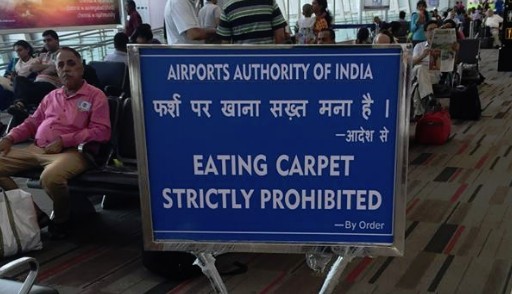 印度金奈機場竟然出現「嚴禁吃地毯」,這到底是這麼一回事呢?照片拍攝者Justin Ross Lee也相當不解,拍下照片後上傳網路,照片PO網後隨即被網友瘋傳,有網友表示「英文真的很重要啊」、「好好笑」,也有網友搞笑說「說不定真的有人就愛吃地毯!」
