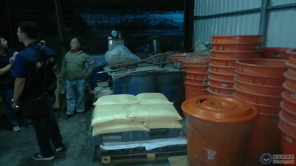 ▲警方在私釀酒工廠發現大批製酒原料,一旁藍色塑膠桶內裝有不明化學液體(圖/楊佩琪翻攝)