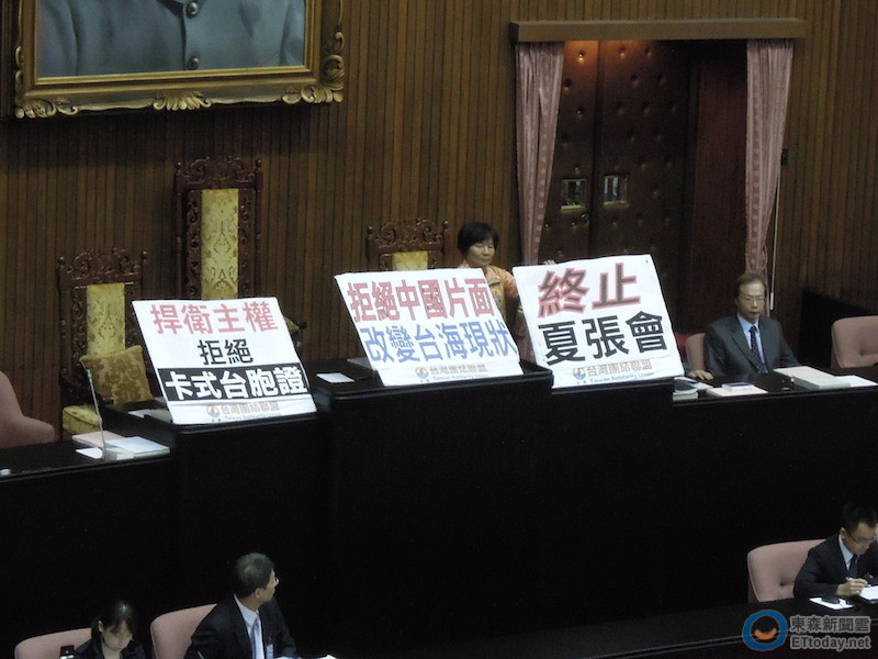 台聯黨團不滿中國片面實施卡式台胞證,25日立法院會再度站上主席抗議,議程暫停1小時後,朝野黨團提出共同聲明,要求行政院長毛治國施政報告時,一併進行卡式台胞證專案報告。毛治國指出,目前觀察卡式台胞證無衛星定位、記錄生物特徵等功能,而兩岸關係定位不因為陸方單方面作為有所改變。