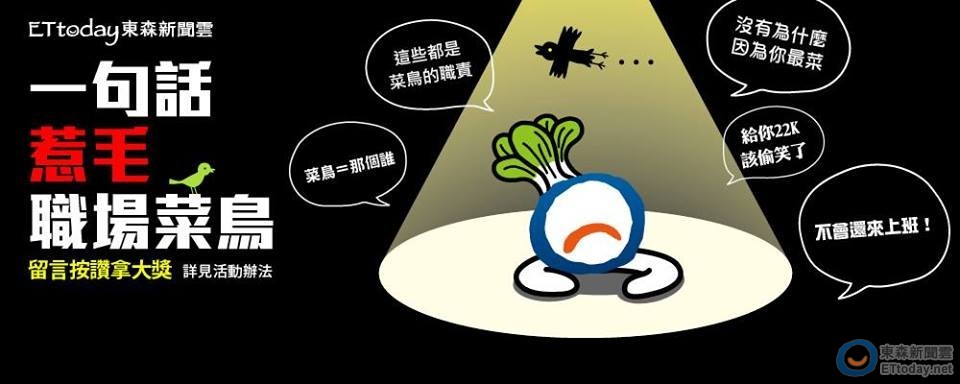 每個人都有出初茅廬的時光,剛踏入職場一身菜味免不了有被羞辱的經驗,只好忍氣吞聲、幻想過無數次老子不幹的情節。近日《ETtoday東森新聞雲》發起 「一句話惹毛職場菜鳥」大賽,比賽從9月22日至28日開放留言,引爆網友大吐苦水,「欸,你身上的蟲跑出來了」、「腦袋是拿來想辦法,不是只會長頭髮」、「這有很難嗎?」活動網羅各行各業、各種階層最菜的酸甜苦辣,將怨氣化為黑色幽默!