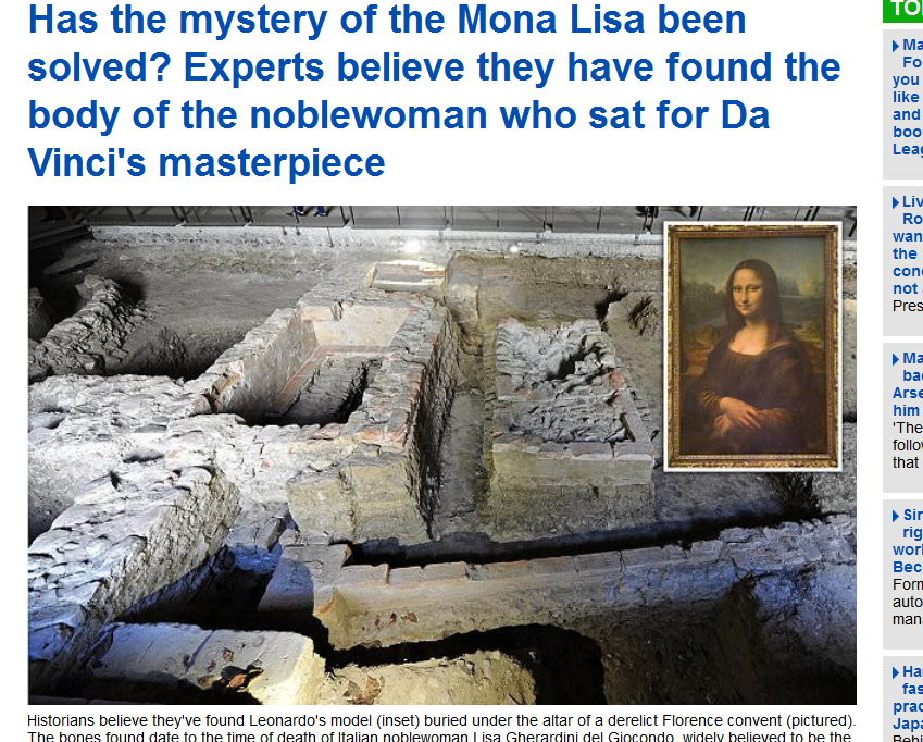 4年前,藝術史專家在義大利佛羅倫斯的聖歐蘇拉修道院(Sant'Orsola convent)的地下陵墓挖掘出一批人類骸骨。專家們花長時間進行分析和研究後表示,相信當中部分骸骨屬於16世紀義大利名媛麗莎•格拉迪尼•喬宮多(Lisa Gherardini del Giocondo)。