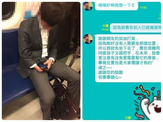 女網友在「爆廢公社」貼文說,「我平常自己很累,也會坐博愛座,只是正義魔人太多,小時候被罵過就嚇到了」此外她分享自己看到一位穿西裝的男生坐在捷運車廂博愛座上,「帥哥捲起了袖子之後,我才知道他坐博愛座的原因」,她想說雖然不認識他,但想po文給予祝福鼓勵。