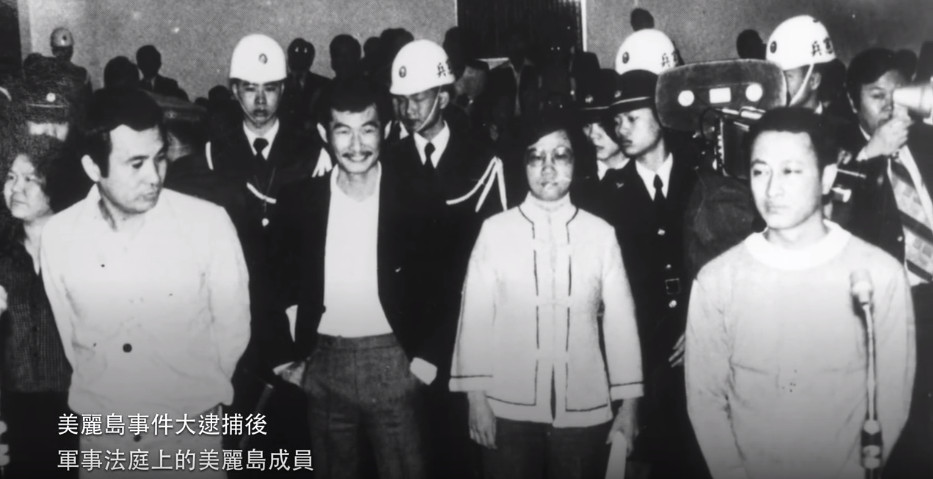 ▲美麗島事件大審,左起依序為陳菊、姚嘉文、施明德、呂秀蓮、林弘宣。(圖/翻攝自YouTube時報出版人文科學線頻道)