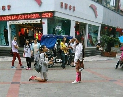 事發於23日,在綿陽市建國門附近,綁著馬尾的女孩下跪,手上拿著戒指,向另一名長髮女孩求婚。網上有消息指稱,兩人在一起已經7年。