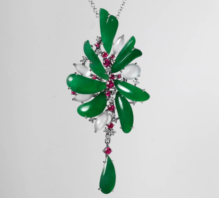 ▲翡翠與冰種白翡花形墜飾,搭配鑽石、粉紅剛玉與紅寶石,價格1,180,000元(不含項鍊)。(圖/業者提供,以下同)