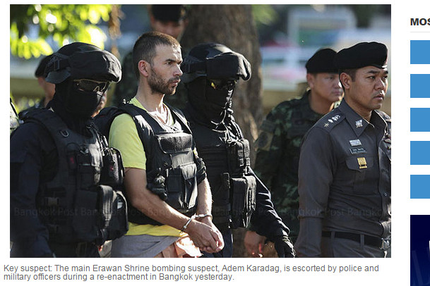 泰國警方宣布,在曼谷近郊公寓落網的嫌犯卡郎達(AdemKaradag),就是曼谷四面佛爆炸案中放置炸彈的主嫌「黃衣背包男」,除了將被控包含預謀殺人在內的八項罪名外,也被帶往案發現場模擬作案情形。