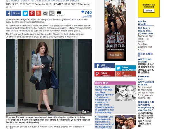 根據《每日郵報》(Daily Mail)報導,尤金妮婭公主在今年7月進入倫敦的「Hauser & Wirth」藝術畫廊擔任副藝術總監,只是她上任之後卻是時常請假。因為她公主的身分,時常得出席活動,導致她從7月上任,10個星期的工作天內,她就請了25天的假。