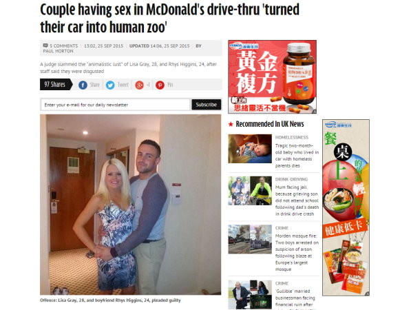 根據英國《鏡報》(The Mirror)報導,28歲的女子格雷(Lisa Gray)在今年5月某日和24歲的男友席金斯(Rhys Higgins)到夜店狂歡,離開後約莫在凌晨4點半左右,到了一間麥當勞得來速點餐,不料卻在等候期間,格雷一時性起,竟然就在麥當勞員工可見的視線範圍內,直接把手伸到席金斯的跨下撫弄並做出不少猥褻動作。