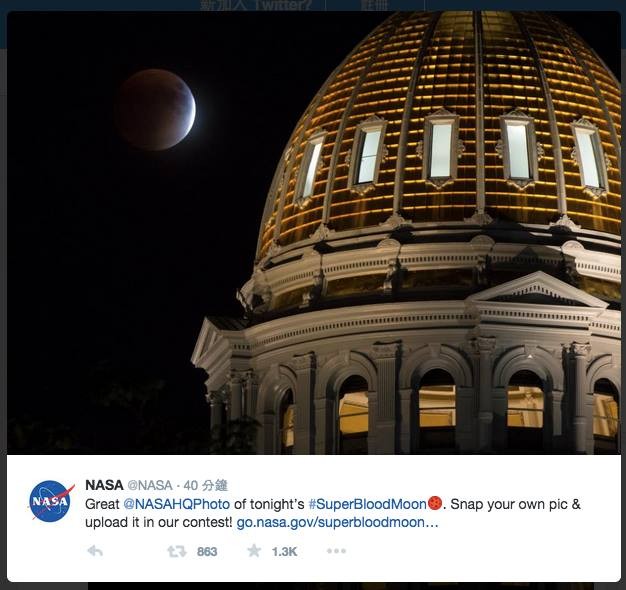 雖然台灣因為地理位置,無法看到月全食的美麗景象,但是美國航空總署(NASA)也推出線上直播,讓不能看見「血月」加上「月全食」本尊的民眾,也能一睹奇觀。