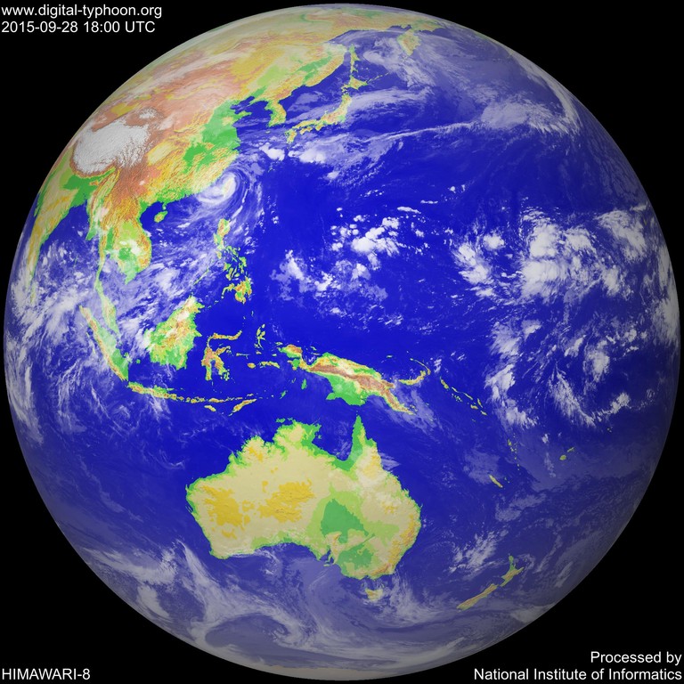杜鵑戲劇性轉變襲台,日本氣象衛星向日葵8號(Himawari-8)觀測到的畫面,28日杜鵑侵台期間,厚實的暴風圈籠罩全台,完全蓋住寶島,從衛星拍攝已經無法找到台灣在哪,消失地表,網友看了也忍不住驚呼連連。