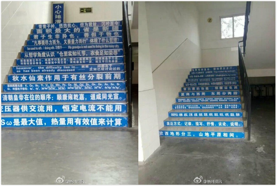 四川成都崇洲市的崇慶中學為了讓學生溫故知新,把各科課本常用的公式要領一一貼在樓梯的台階上,方便上下樓時閱讀,以後學生不只在教室裡讀書,連走在樓梯上都可以一邊學習,而且各科內容都有,簡明扼要容易背誦。網友直呼學校實在「太有才」了。