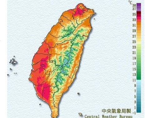 杜鵑颱風剛走,台灣今天恢復高溫的天氣型態。中央氣象局表示,由於各地今天吹偏南風,再加上過山沉降作用,北台灣中午氣溫持續升高,台北市在下午2時5分時出現35.8度高溫,基隆上午也出現34.6度;氣象局稍早發布即時天氣訊息,提醒民眾今天白天氣溫偏高,請注意防曬、多補充水分並預防中暑。