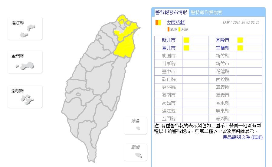 中央氣象局表示,受到鋒面通過和東北風增強,2日北部和東北部氣溫稍轉涼,北部、東半部地區及澎湖、金門、馬祖亦轉為短暫陣雨的天氣,並有較大雨勢發生,午後中南部地區有局部短暫雷陣雨。氣象局稍早已針對新北市、台北市、基隆市、宜蘭縣發布大雨特報,提醒民眾注意瞬間大雨、雷擊及強陣風。