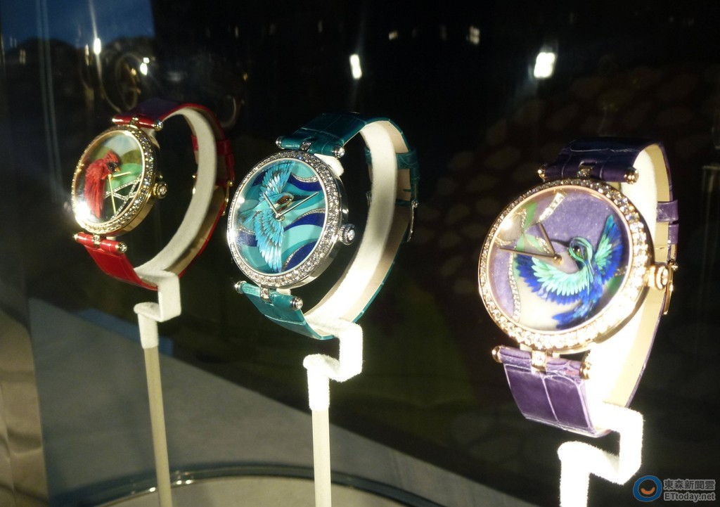 ▲三枚全新Extraordinary Dials™ 非凡工藝錶盤腕錶,展現微型羽飾工藝及硬寶石細工鑲嵌的完美結合。(圖/記者虞煥榮攝)