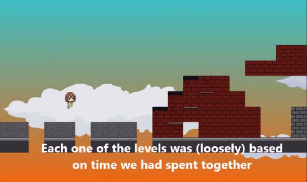 遊戲設計者LA Pike設計的這款「求婚」遊戲是以女友為主角,遊戲方式類似超級瑪莉歐,但遊戲的過程卻巧妙地加入兩人相處的點點滴滴,讓女友在認真通關的同時,能重溫美好的回憶,在遊戲的最後一幕,螢幕秀出字幕「一個人前進太危險了,拿好這個!」接著男生拿出準備好的鑽戒,向女友說出幾個字「妳願意嫁給我嗎?」,讓女生紅著眼眶,掩面點頭。