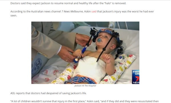 根據《The Inquisitr》的報導,幫男嬰進行手術的脊椎外科醫生阿斯金(Geoff Askin)表示,不少兒童在受到這樣嚴重傷害後,幾乎都無法生存,即使動手術順利地將頭部接回存活下來,未來恐怕都會無法移動或自行呼吸。