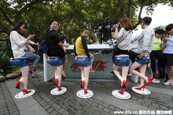 ▲ 創意美腿彩色凳亮相南京街頭,人人都有熱褲、高跟鞋配雙大長腿。(圖/王新/東方IC)