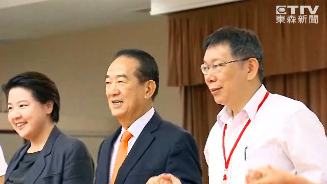 不過,有趣的是在席間柯文哲與宋楚瑜手拉手高喊口號的時候,先是喊「親民黨加油」,柯市長非常配合,但接著喊「宋楚瑜凍蒜」的時候,柯文哲並沒有再拉著宋楚瑜的手,也沒有出聲,僅微笑拍手。