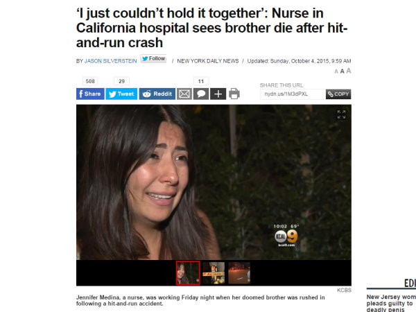 根據《紐約每日新聞》(New York Daily News)報導,美國加州一名護士珍妮佛(Jennifer Medina),2日晚間在急診室值班,當晚一名23歲男子,因踩著滑板過馬路時不慎遭小貨車撞飛,被送往醫院急救。當時珍妮佛正忙著照顧其他傷病患,第一時間並未注意到這名男子。