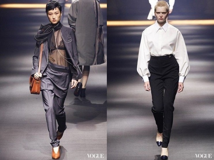 Lanvin秀一開場就先帶來「星期一氛圍」。噢,誰來幫幫忙,要穿什麼去上班?好吧,那就來件有著小尖領和泡泡長袖的白襯衫,再搭上高腰黑長褲,完美!
