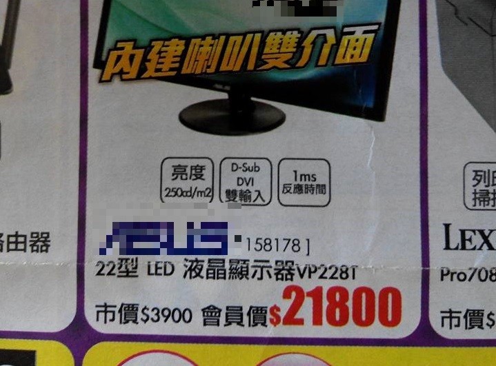 網友提供的照片可以看到,知名廠牌的22型液晶螢幕顯示器,原價是3900元,會員價竟然要21800元,還打上了大大的紅字標誌,吸引人注意,可是這會員價格卻高得嚇人,讓人覺得加入會員不就虧大了嗎?讓原PO直說,「我還是不要當會員好了!」